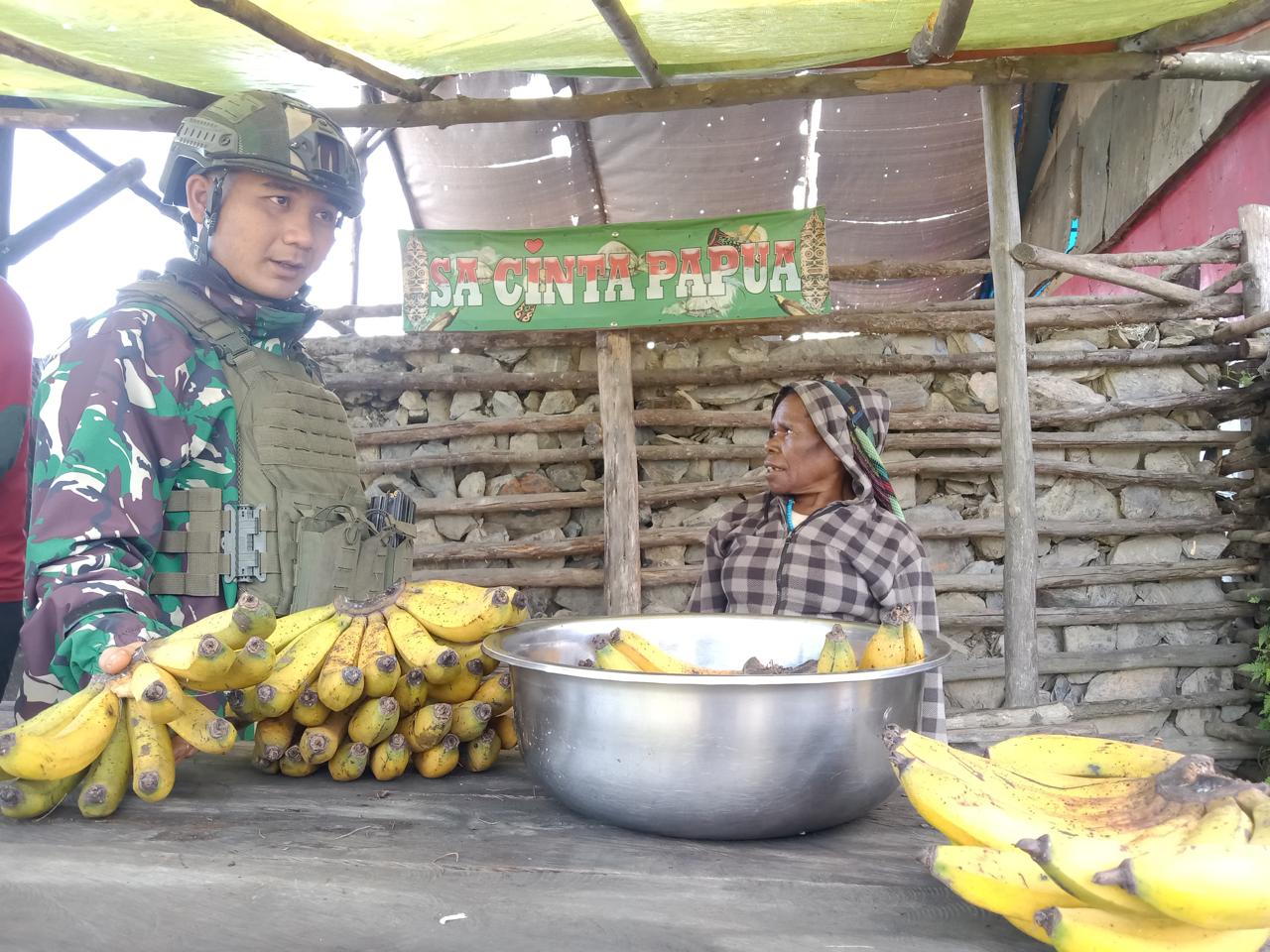 WOMBRU – Satgas Yonif 323 Buaya Putih Melalui Titik Kuat (TK) Pintu Jawa, melaksanakan kegiatan ROSITA atau Borong Hasil Tani milik salah satu mama-mama masyarakat Kampung Wombru, Distrik Megeabume, Kabupaten Puncak, Provinsi Papua Tengah, Jumat (18/10/2024).