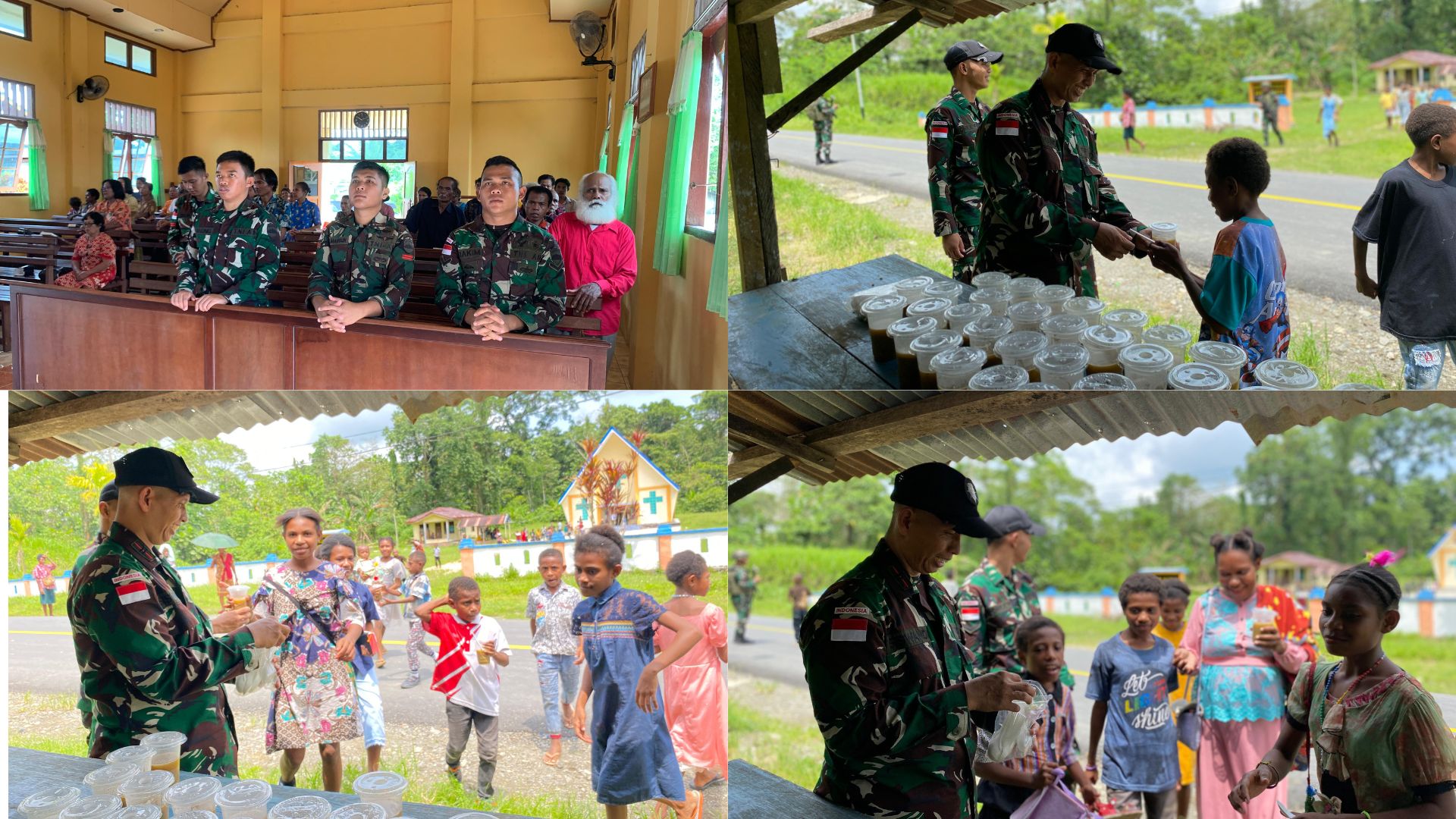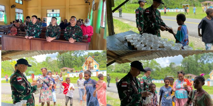 Kab Keerom – Satuan tugas pengamanan perbatasan RI-PNG Yonif 131/BRS Terus menjalin kebersamaan antara personel Pos Wambi dengan Masyarakat melalui kegiatan Ibadah bersama hari Minggu serta membagikan Makanan berupa bubur kacang hijau Kepada masyarakat Papua bertempat di Gereja Katolik Santopetrus Kampung wembi, Distrik Mannem, Kabupaten keerom, Papua, Minggu (10/11/2024).