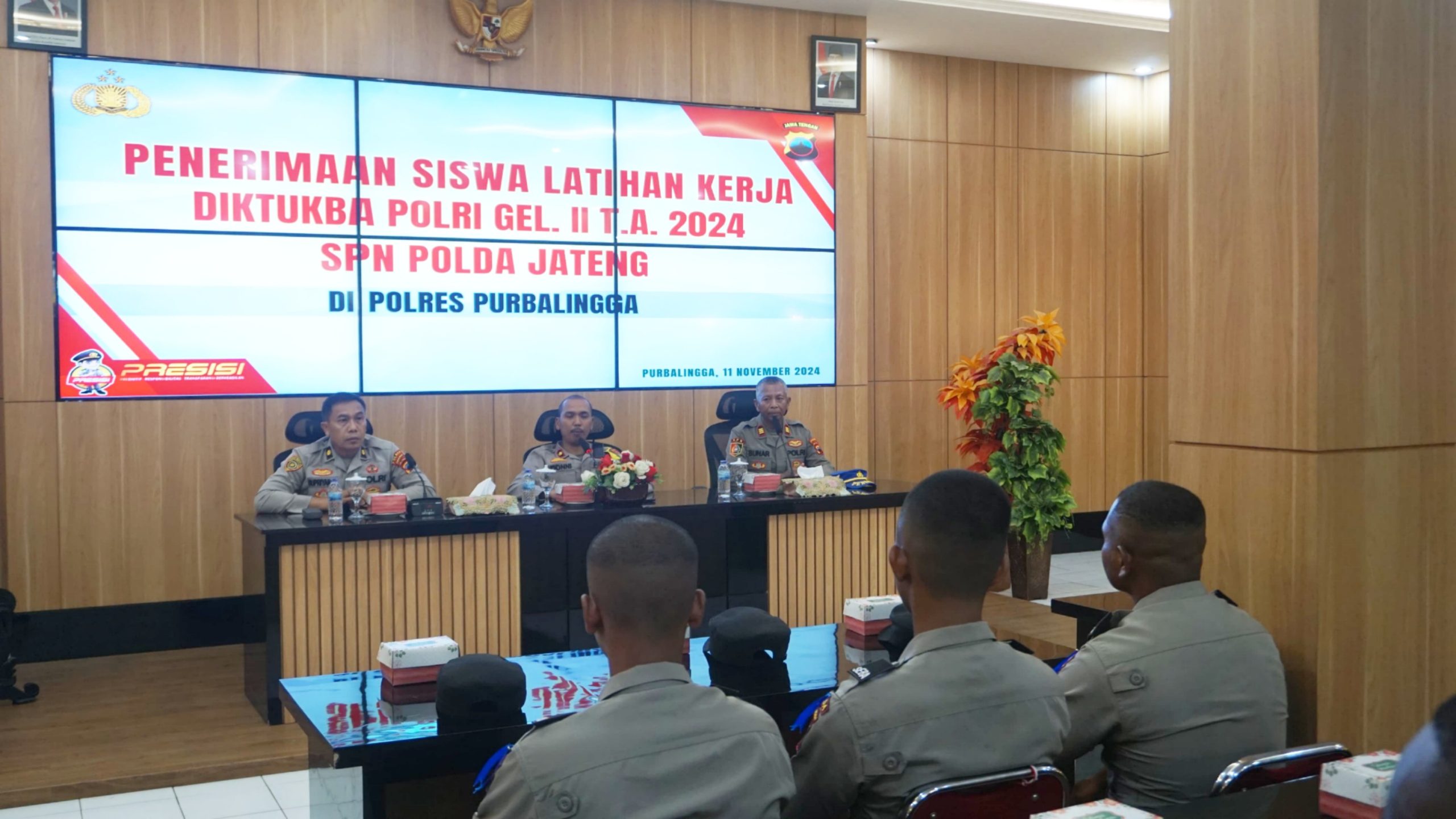 Polres PurbaIingga – Polda Jateng | Sebanyak 25 siswa pendidikan pembentukan bintara (Diktukba) dari Sekolah Polisi Negara (SPN) Polda Jateng akan melaksanakan latihan kerja (Latja) di Polres Purbalingga. Para siswa bersama pendamping diterima di Aula Wicaksana Laghawa Mapolres Purbalingga, Senin (11/11/2024).