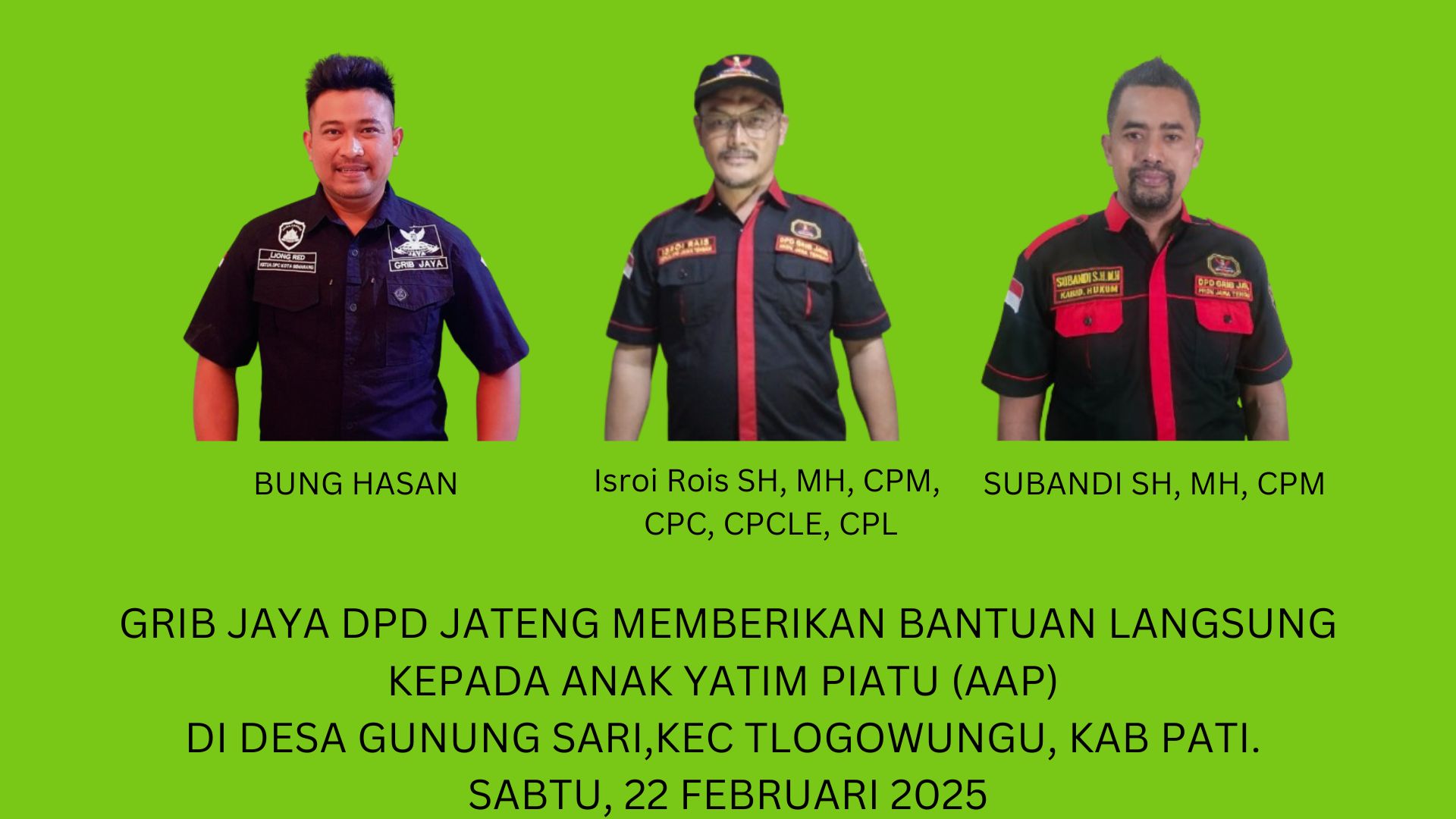 Menindaklanjuti instruksi tersebut, Ketua DPD Jateng bersama Kabid Hukum GRIB Jaya DPD Jateng, Subandi, SH, MH, CPM, dan ketua OKK bung Hasan segera mendatangi rumah AAP guna memberikan bantuan langsung ( sembako) dan menjamin pendidikannya sampai lulus sekolah.
