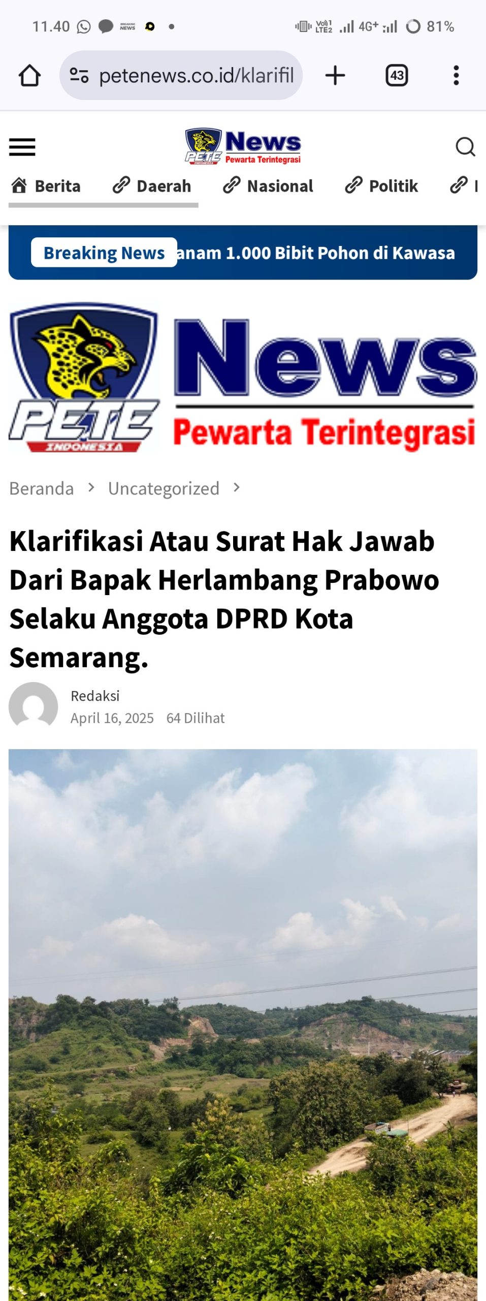 Semarang — Nama HP disebut-sebut dalam pemberitaan terkait dugaan keterlibatannya dalam aktivitas galian C ilegal di wilayah Mangunharjo, Kecamatan Tembalang, Kota Semarang. Menanggapi hal tersebut, HP akhirnya menyampaikan hak jawab.