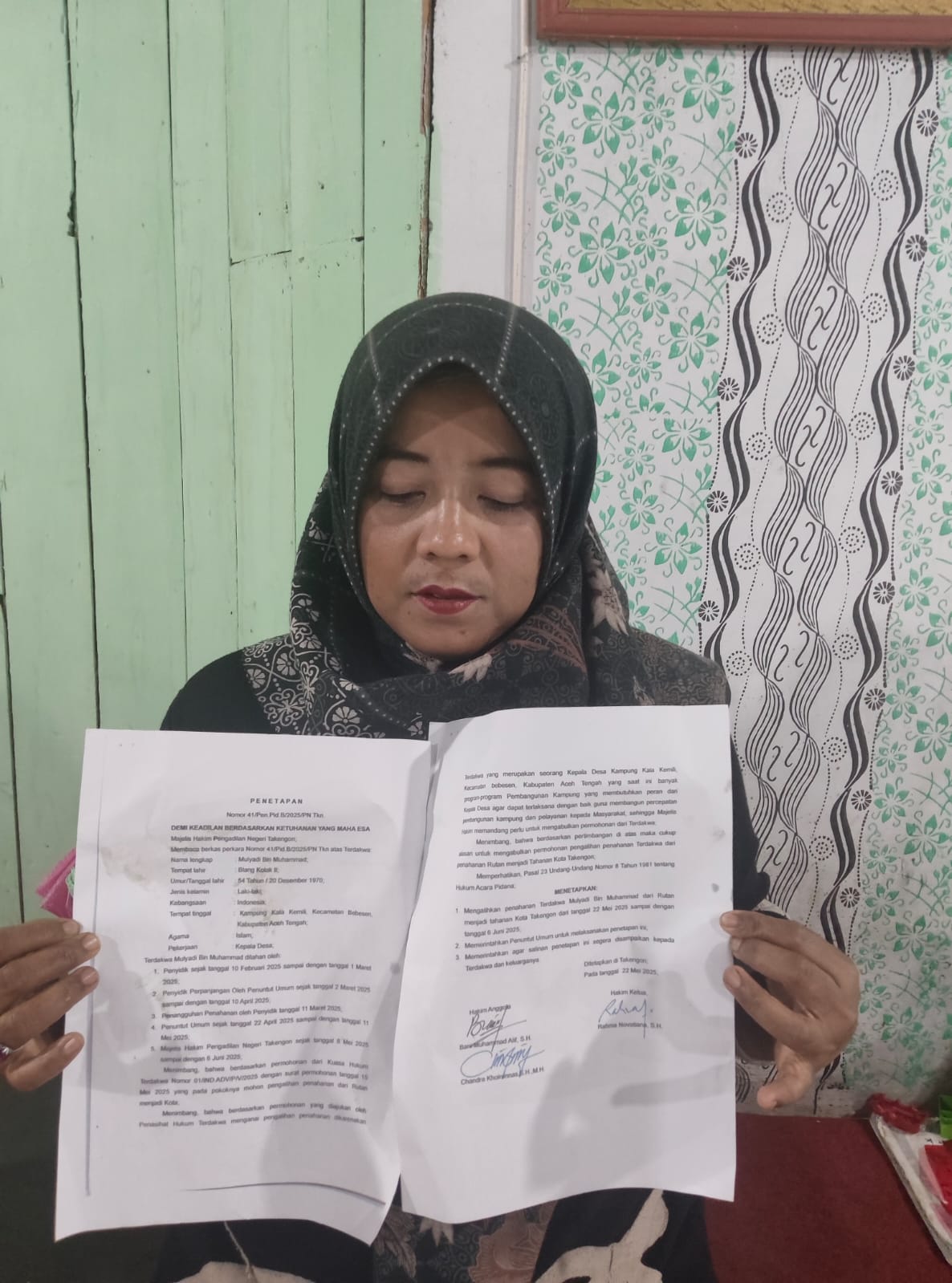 Keputusan tersebut diambil dalam sidang yang digelar pada Kamis, 22 Mei 2025, dengan alasan bahwa Mulyadi masih menjabat sebagai Reje (Kepala Desa) dan memiliki kewajiban terhadap kegiatan desa. Namun, informasi ini dibantah keras oleh salah satu pihak pelapor, Ummi Kalsum, warga Kampung Kala Kemili, Kecamatan Bebesen, Kabupaten Aceh Tengah.