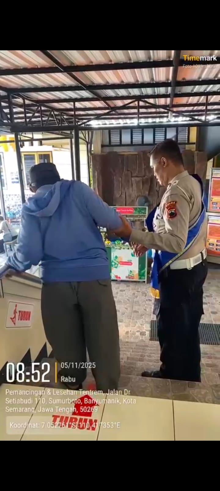 Semarang — Pelayanan humanis kembali ditunjukkan oleh jajaran Ditlantas Polda Jawa Tengah melalui para Duta Pelayanan yang bertugas di Samsat Kota Semarang 2. Dalam kegiatan pelayanan pajak kendaraan bermotor, seorang Duta Ditlantas Polda Jateng dengan sigap membantu seorang wajib pajak yang mengalami kesulitan berjalan saat menaiki dan menuruni tangga di pintu masuk kantor Samsat.