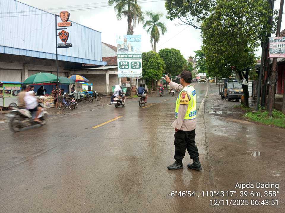 Dibawah rintik hujan, para personel tetap sigap mengatur arus kendaraan di sejumlah titik rawan kemacetan dan genangan air, guna memastikan kelancaran serta keselamatan pengguna jalan.