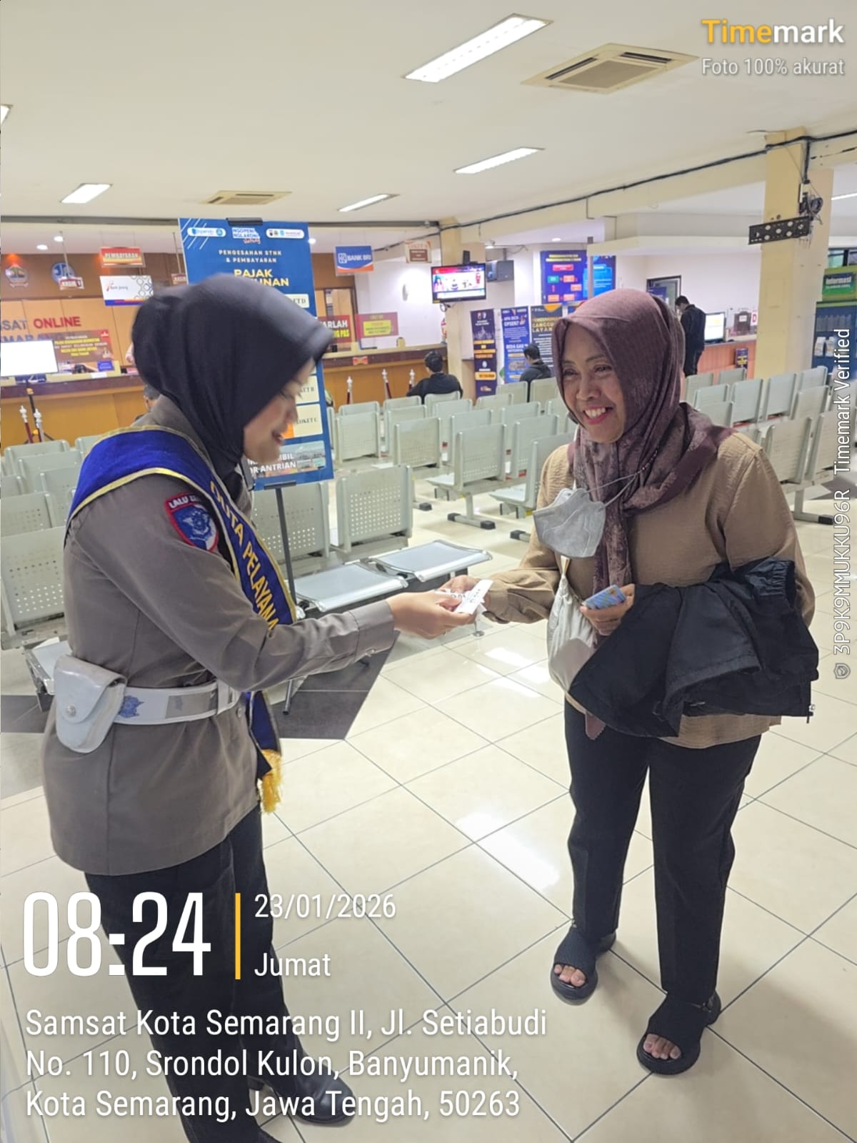 Semarang, binnews.id — Ditlantas Polda Jawa Tengah terus berupaya meningkatkan pelayanan publik. Salah satunya melalui kehadiran Duta Pelayanan di Samsat Semarang 2 yang secara aktif memberikan arahan kepada wajib pajak dalam proses perpanjangan dan pengesahan Surat Tanda Nomor Kendaraan (STNK).