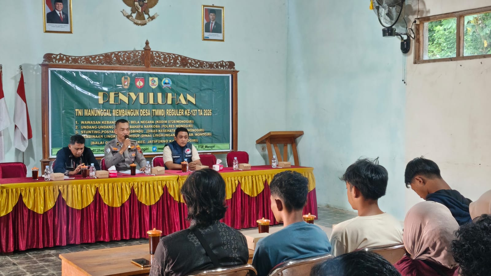 Satgas TMMD Reguler ke-127/Wonogiri bekerja sama dengan Polres Wonogiri menggelar penyuluhan bahaya narkoba di Desa Kembang, Kecamatan Jatipurno, Kabupaten Wonogiri, Selasa (17/2/2026).