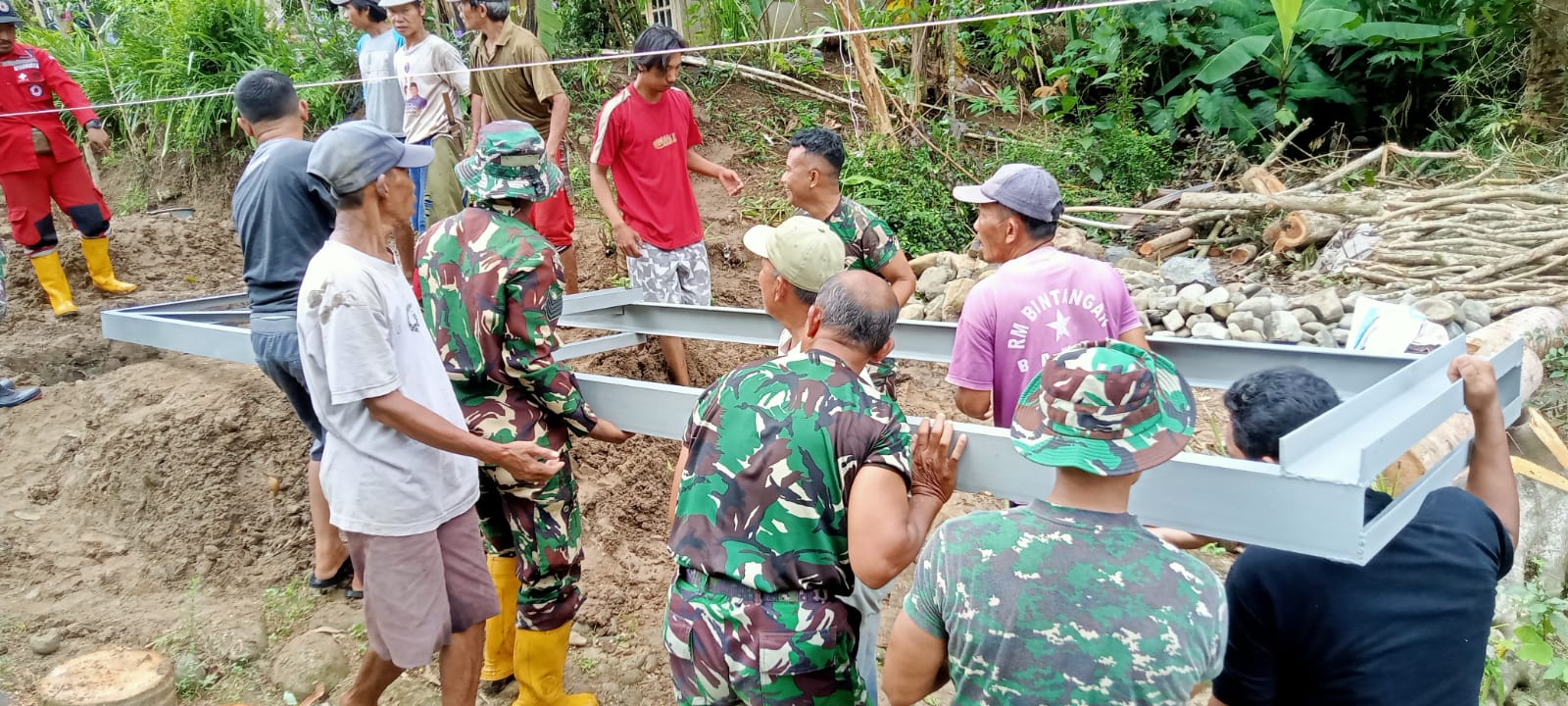 Banyumas, binnews.id – Suara cangkul yang menghantam tanah berpadu dengan gemericik air sungai yang mengalir tenang di Desa Kalibagor, Kecamatan Kalibagor. Di RT 01 RW 03, pagi yang cerah menjadi saksi bagaimana harapan mulai dibangun dari tepian sungai. Prajurit Kodim 0701/Banyumas berdiri berdampingan dengan perangkat desa dan masyarakat, merintis pembangunan Jembatan Gantung Perintis Garuda.