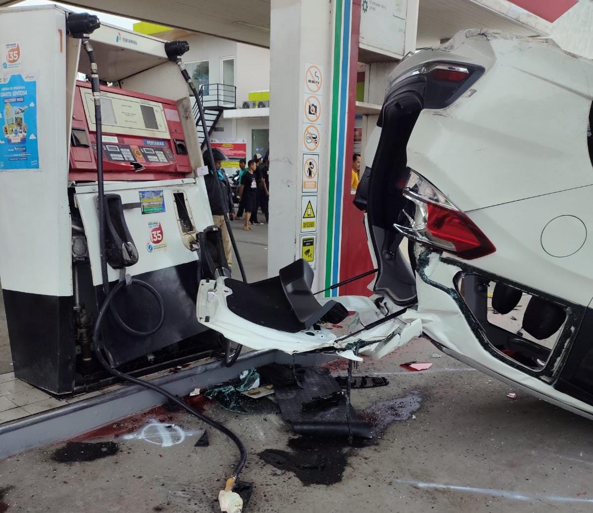 “Mobil kemudian menabrak pembatas taman SPBU hingga terguling. Dalam posisi terguling itu kendaraan membentur sepeda motor yang sedang mengisi BBM serta operator SPBU yang berada di dekat dispenser,” terang AKP Kukuh.