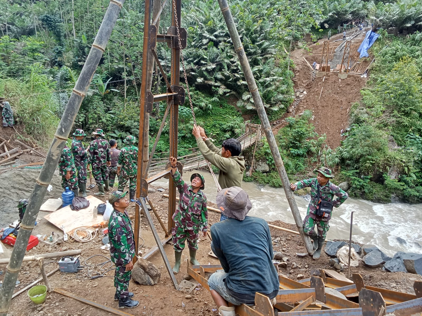 Banjarnegara, binnews.id – Kebersamaan prajurit Kodim 0704/Banjarnegara dan masyarakat kembali terpatri dalam pembangunan Jembatan Gantung Garuda sepanjang 70 meter di atas Sungai Brakah.