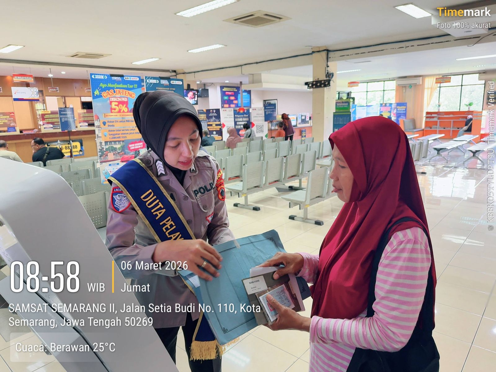 Semarang, binnews.id — Ditlantas Polda Jawa Tengah menghadirkan Duta Pelayanan di Samsat Semarang 2 guna membantu masyarakat yang melakukan pengesahan maupun perpanjangan Surat Tanda Nomor Kendaraan (STNK).