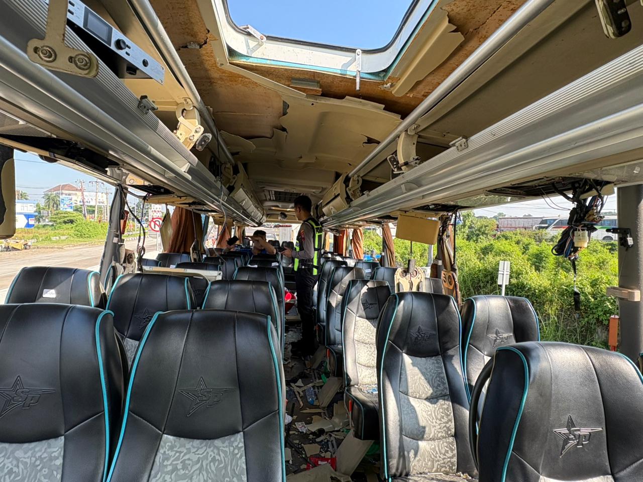 Setibanya di lokasi, petugas mendapati kondisi bus mengalami kerusakan parah pada bagian kabin depan sebelah kiri. Pecahan kaca berserakan dan pintu bus mengalami kerusakan akibat ledakan yang diduga berasal dari area bawah kursi sopir. Selain itu, tercium bau menyengat menyerupai bahan petasan dari dalam kabin.